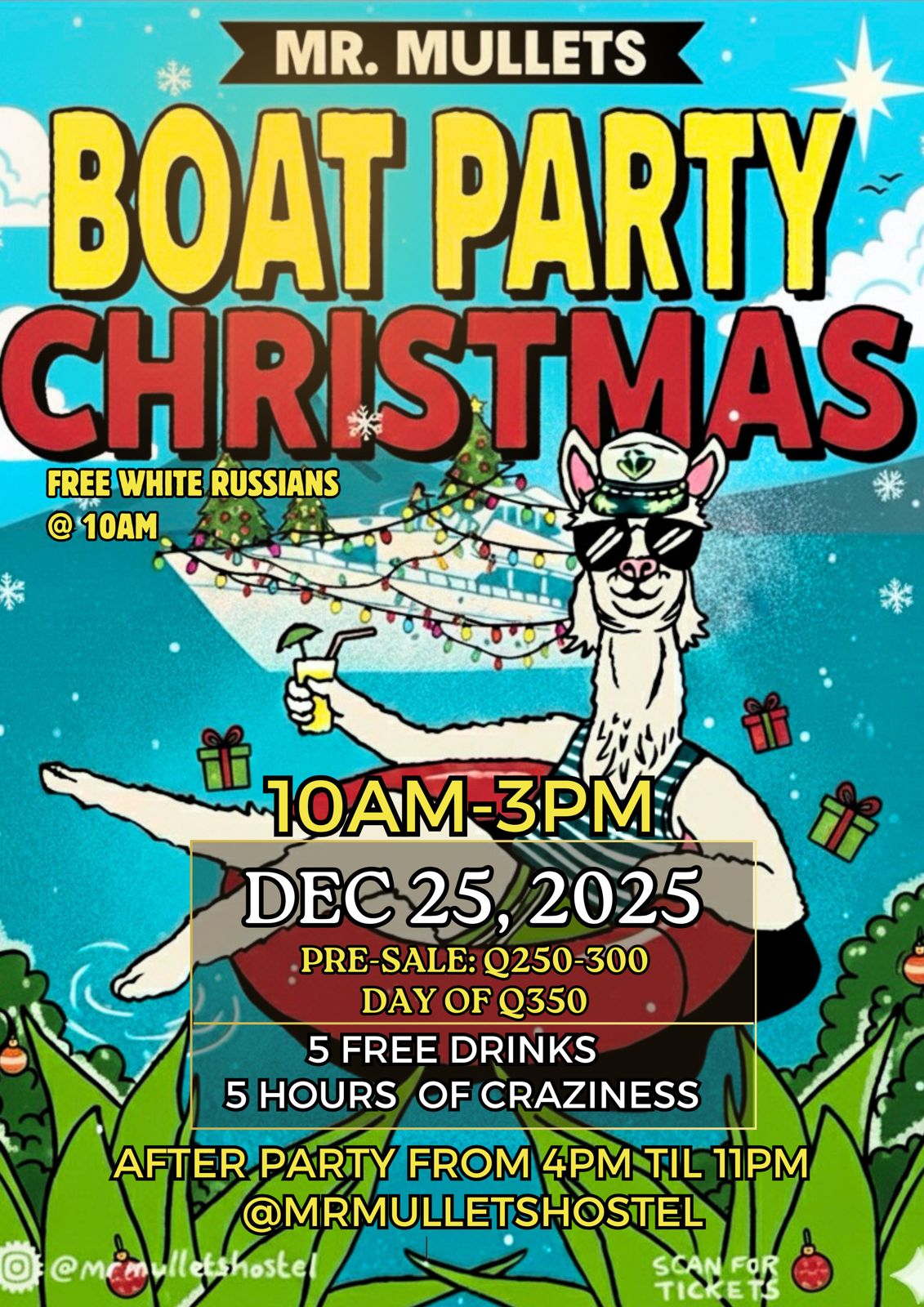 ¡Bienvenido a bordo de la fiesta en barco más grande de Centroamérica! Bebe y diviértete en nuestra barco de tres niveles. ¡Únete a nosotros para la mejor experiencia de fiesta en el Lago de Atitlán. Nuestro barco consta de 3 niveles es la mayor fiesta en barco en el lago y ofrece impresionantes vistas de los volcanes. Reúnete con nosotros en Mr. Mullets hostel a las 10 de la mañana para pasar un día inolvidable en el agua. El barco regresa a las 15.00, así que tendrás tiempo de sobra para disfrutar del sol, nadar en el lago y bailar en la cubierta del DJ. Y al bajar continuamos con nuestro after party hasta la 11 de la noche Tu entrada incluye 5 bebidas. Nota: Sólo se servirán cócteles a bordo, pero puedes traer tu propia cerveza o cualquier otra bebida.