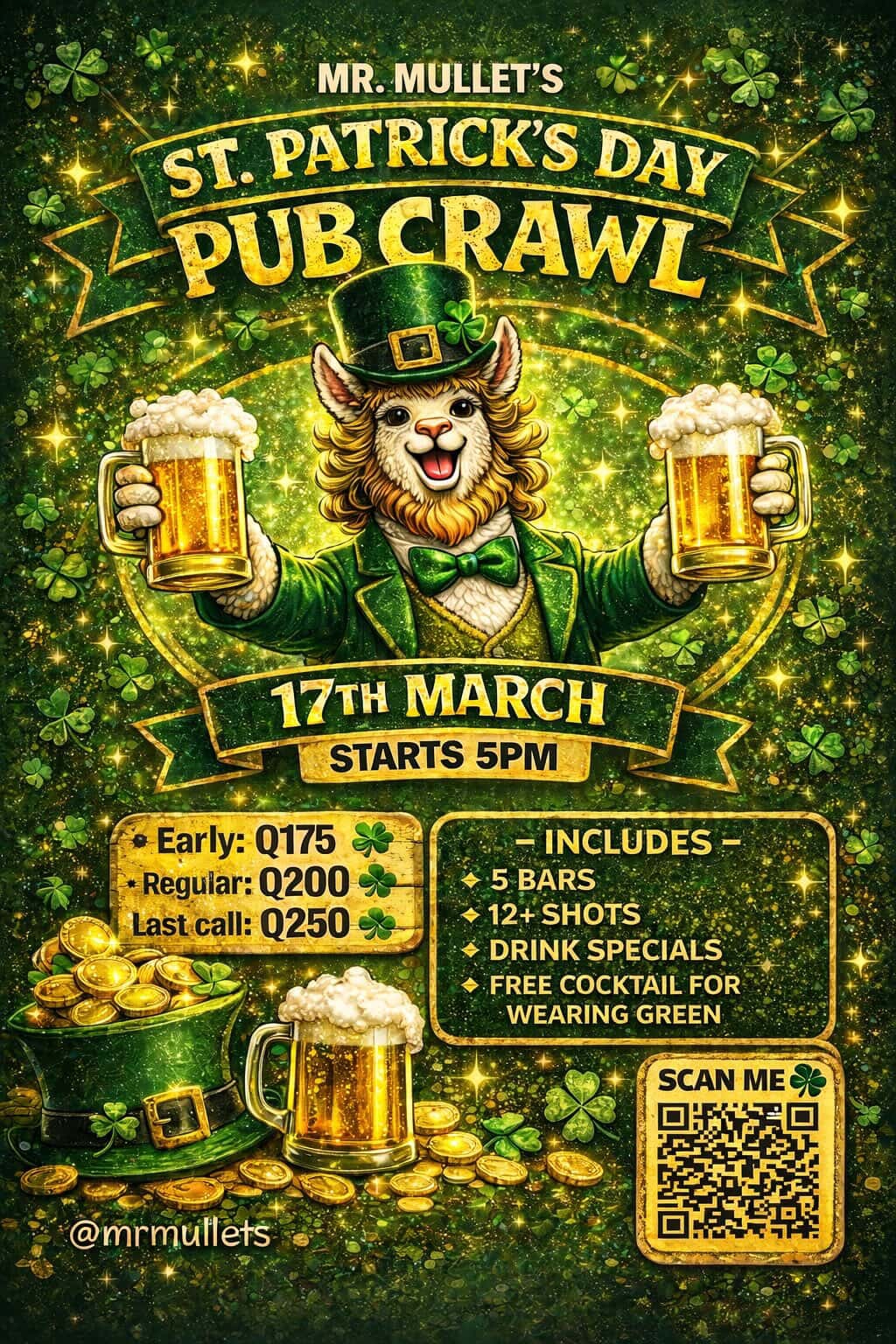 Join us for 6 hours of madness and unforgettable memories at the special St. Patrick’s Edition of the Mr. Mullets Pub Crawl.